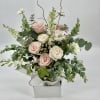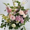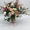 A refined and romantic Valerie's Dream , arrangement featuring premium blush and ivory roses, delicately paired with seasonal pastel blooms and lush greenery .Designed in a elegant garden style and presented in a clear vase ,this timeless composition offers effortless and sophistication for life's most meaningful moments .