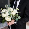 A vision of modern bridal elegance ,this bouquet is a study in restraint and romance .Lush with blooms are gathered into a softy sculptural form . Contemporary or classic bridal bouquet feels effortlessly luxurious-designed to complement and to endure as a symbol of refined beauty and quiet sophistication. Any color or style available by request .