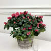 Beautiful blooming azalea plant in light-colored basket. Most are shades of pink or red. A perfect gift for any occasion. A gift for the gardener!