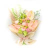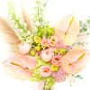 Front side bouquet! Whimsical and elegant, Anette arrangement features a lovely mix of white, green and pink-peach flowers. With delicate blush anthurium, peach garden roses, soft white delphinium, green hydrangea and pampas grass. This lush bouquet manages to find a happy balance between understand and dramatic. Anthuriums Symbolize Hospitality Due to their open, heart-shape and long-lasting characteristics they are popular as hostess or hospitality gifts.