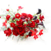 Elegant and irresistible this beautiful arrangement of red roses, red ranunculus and black callas takes your breath away. Red flowers represent desire, strength, and passionate love. With beauty, courage and heat as its symbolism, it’s no surprise that a bouquet filled with rich, red blooms knows no restraint. Comes in a gold vase.
