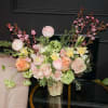 Bright, cheerful, and beautifully expressive, this garden-inspired arrangement is a true statement of joy. Featuring soft blush and peach roses, delicate ranunculus, sunny yellow blooms, and lush green hydrangea, it’s artfully accented with flowering branches and fresh foliage for a natural, airy look.