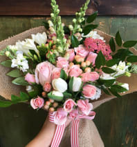 Soft pretty pink roses, tulips, and anemone mixed bouquet.