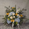 This elegant urn piece will be the perfect selection for either your thoughts of condolence or your treasured memories. From its deep blue delphinium to its delicate white roses, yellow spray roses, eucalyptus, and stock; our "Timeless Blues" arrangement beautifully conveys your heartfelt sympathy.