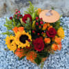 Autumn Pumpkin Vase with Sunflowers, Orange Roses, Red, Green and Orange Chrysantemums, Yellow Solidago, and Seasonal Greens.
