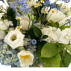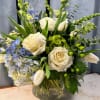 This Lilypots arrangement features a refined blend of blue, green and white flowers, thoughtfully designed to feel timeless, airy, and effortlessly beautiful. Each bouquet is styled in a clear glass vase with a hand written enclosure card. Choose from three sizes — Standard, Deluxe or Premium.