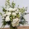 "Marvel at this elegant floral arrangement, artfully arranged in a lavish crystal vase. Its striking blend of white and green hues creates a captivating display that brings a touch of sophistication and beauty to any setting."