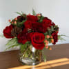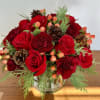 The winter flower arrangement features vibrant red roses and carnations accented with Christmas greenery.