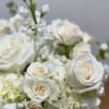 This beautiful vase is arranged with white hydrangea, white stocks, white roses, and white spray roses.
