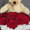 Charming arrangement featuring 10 fresh red roses nestled in a natural woven basket, beautifully accented with soft tissue paper, a satin ribbon, and a plush teddy bear—perfect for expressing love in the sweetest way.