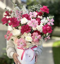 "Pink Dahlia Dream," a stunning bouquet that features vibrant pink dahlias paired with delicate lisianthus blooms and lush greenery. This enchanting arrangement captures the essence of elegance and charm, with the bold dahlias serving as the focal point, exuding a sense of joy and sophistication. The soft, ruffled petals of the lisianthus add a touch of romance, while the fresh greenery provides a natural balance, enhancing the overall beauty of the bouquet. Perfect for any occasion, whether it's a birthday celebration, a heartfelt gift, or simply to brighten your home, this bouquet radiates warmth and beauty that will leave a lasting impression.