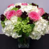 Delightful collection of white and green Hydrangea with pink Roses and burgundy berries.