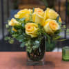 Dozen roses designed low and compact in a square vase accented with eucalyptus and bear grass. Guaranteed to please anyone.