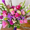 Made of purple, pink, white roses, lilies, and other flowers of lots of various textures, beautiful. abundant, and tall arrangement in a high-quality violet glass vase.