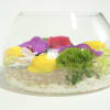 This design contains hydrangea, phalenospis orchids, ranunculus, rose and tric floating over a bed of white rock.