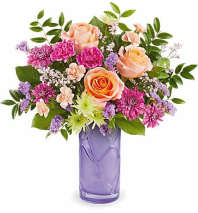 Pour on the springtime charm with this delightful garden bouquet, presented in a charming stoneware pitcher with beautiful aqua glaze.