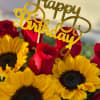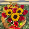 Inside, a joyful explosion of fresh red roses and golden sunflowers greets you—roses for passion, sunflowers for warmth and cheer. Their contrasting textures and colors are arranged in a lush swirl, like a blooming embrace, with hints of greenery peeking through to add depth and life.