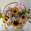 Bright, cheerful, and full of charm, The Sunshine Basket features radiant sunflowers, elegant pink roses, soft white daisies, and airy baby’s breath, all nestled in a classic white wicker basket and finished with a delicate satin bow. Perfect for birthdays, thank yous, or simply to brighten someone’s day.