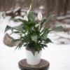 Known commonly as the peace lily, this dark leafy plant with elegant white blossoms makes a timeless gift. Known for its hardiness indoors and air cleansing properties, there's nothing small about the sentiment delivered along with this stunning plant. Comes in ceramic, woven basket, or terra cotta. Standard size is a 6 inch plant in a basket, deluxe is in ceramic, premium is an 8 inch plant in ceramic. Peace lilies may or may not be in bloom at time of delivery. If they are not in bloom they may be smaller in appearance to the featured photos. Their size is contingent on greenhouse conditions and supply and demand.