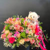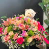 Black Ceramic Base, Lilies, 36 Roses, 1 Dozen Of Spray Roses, Mini Carnation, Baby Breath, Teddy Bear