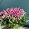 75 Pink tulips in fishbowl vase with aspidistra leaves