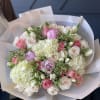 Handcrafted bouquet with hydrangeas, roses, peonies, tulips, greenery in modern paper wrapping. Vase not included