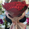 Elegantly packaged long red roses.