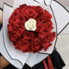 Red and white roses, wrapped in white and black paper Glass vase not included