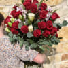 An elegant design that's sure to WOW. A tall arrangement of 40 or upgrade for 50 premium roses, accented with seasonal blossoms and greenery for a lush display. A perfect way to celebrate a milestone birthday or anniversary or celebrate an extra special Valentine. Arranged in a clear glass vase with pearls or river stones.