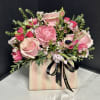 Perfect for Mother's Day, Birthday, or a fun just because. Our ceramic Miranda Handbag Vase features white & pink vertical stripes, a glossy finish, upright handles, and is versatile for repurposing as a fun display in the home once the flowers are done. This adorable vase is filled with our prettiest seasonal pink blooms, foliage and accents.