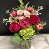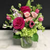 A pretty seasonal garden mix in shades of soft to hot pink. Arranged in our clear glass bloom jar.