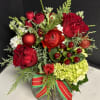 A cheerful seasonal garden mix in red, white and green accented with evergreen. Arranged low and dense in our signature English garden style. Delivered in a clear glass vase. Floral varieties may vary but will be of similar quality and style.