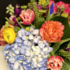 A bright and colorful seasonal mix, designed low and dense in our signature English garden style. Arranged in a clear glass vase. Overall design is approx. 11" x 11"
