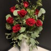A dozen premium Red roses, accented with seasonal greenery and arranged in a ceramic vase.