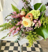 We gathered the most beautiful flowers harvested from spring for this arrangement. Peonies, Ranunculus, Hellebore, and stock.