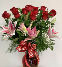 The lovely pink is built of pink hydrangea, hot pink roses, hot pink gerbera, spray roses and more...