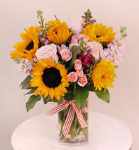 This beautiful arrangement of pastel flowers will surely delight your recipient. Flowers may include roses, hydrangea, majolica spray rose, stock, orlaya, chamomile and greenery in a white hobnail cylinder vase.