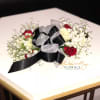 The perfect corsage for a prom date . It has black and sheer ribbon together along with red and white spray roses. The ribbons could be change by request.
