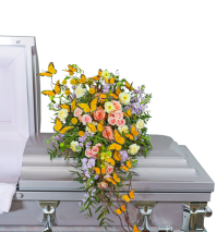 Sympathy flowers are a meaningful way to celebrate the life of the deceased, and forever treasure the memories you made together. Our Treasured Memories Casket Spray features Free Spirit roses, sunflowers, bright pink carnations, liatris, blue delphinium, green hydrangea, stock, and premium foliage. Funeral flowers bring healing in many ways, they serve as a memorial to honor the one that we lost, all while providing comfort to the friends and family left behind.