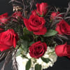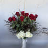 * Stunning tall vase filled with white hydrangeas, a dozen long red roses and romantic dark filler.