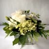 Regular Shown. A lush and lovely arrangement of timeless white and green stems with fresh blooms. Clean and classic. Florals and greenery will vary due to season and availability.