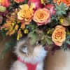 This flower box embodies the essence of autumn, featuring warm orange roses, complemented by red and yellow accents, lush greenery, and the unique touch of pomegranates or apple!