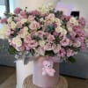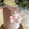 Luxury Valentine’s Day floral arrangement in a velvet hat box featuring blush roses, orchids, hydrangea and a cute teddy keychain. A perfect romantic gift with same-day flower delivery in Los Angeles