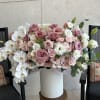 An exquisite composition of blush-toned O’Hara roses, creamy orchids, delicate lisianthus, and soft white flowers — all nestled in a luxurious velvet hat box. This arrangement captures the essence of timeless romance and elevated sophistication. Perfect for grand gestures, anniversaries, or simply saying “you are cherished