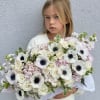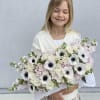 It features stunning, velvety pale pink hydrangeas as the base, complemented by fragrant garden roses in cream and blush tones. The arrangement is crowned with gorgeous white anemones, whose deep black centers provide a striking, modern focal point. This signature anemone rose arrangement is perfect for those seeking luxury and sophistication.
