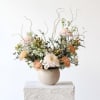 Our "Very Demure" arrangement offers a refreshing alternative to traditional florals. Featuring soft pink cremone mums, elegant carnations, delicate peach hypericum, rich seasonal foliage and artful curly willow, this arrangement brings a subtle yet distinctive color palette to your table. Arranged in the Astrid pot—a tan round container crafted from natural clay, it's the perfect choice for those looking to celebrate in their own unique way.