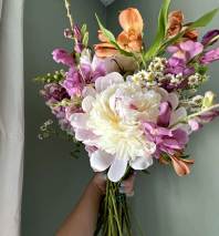 Pinks, Purples and Blues come together in this pastel arrangement. The perfect mix of lush focal flowers nestled amoung dancing wax flowers and frilly larkspur. This design gives wildflower vibes for sure!