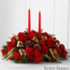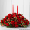 Holiday Classics Centerpiece. Drawing from the rich traditions of holiday décor, this festive centerpiece is set to lend its seasonal beauty to your holiday celebrations. Bright red roses, carnations and mini carnations are arranged amongst an assortment of holiday greens, accented with natural pinecones and a designer red and green striped ribbon. Encircling 2 red taper candles, this lovely centerpiece will bring warmth and Christmas charm to your holiday gatherings with each graceful bloom.