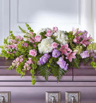 This vibrant arrangement of purple and pink roses, calla lilies, mums, stock, and hydrangea blooms is a special memorial of the colorful life of your loved one.