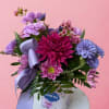 Delicate, dreamy, and full of everyday charm — Tea Party Pastels is a sweet little arrangement that feels like a soft moment in bloom. Designed in a petite tea-themed container in calming shades of blue, lavender, and white, this piece is light, lovely, and effortlessly giftable. Fluffy blue cushions set a serene base, while lavender daisies and a bold purple Fuji mum add just the right pop of personality. Light purple carnations and airy pink waxflower bring gentle romance, all finished with a graceful lavender satin ribbon. Perfect for thank-yous, thinking-of-yous, or simply brightening someone’s day.